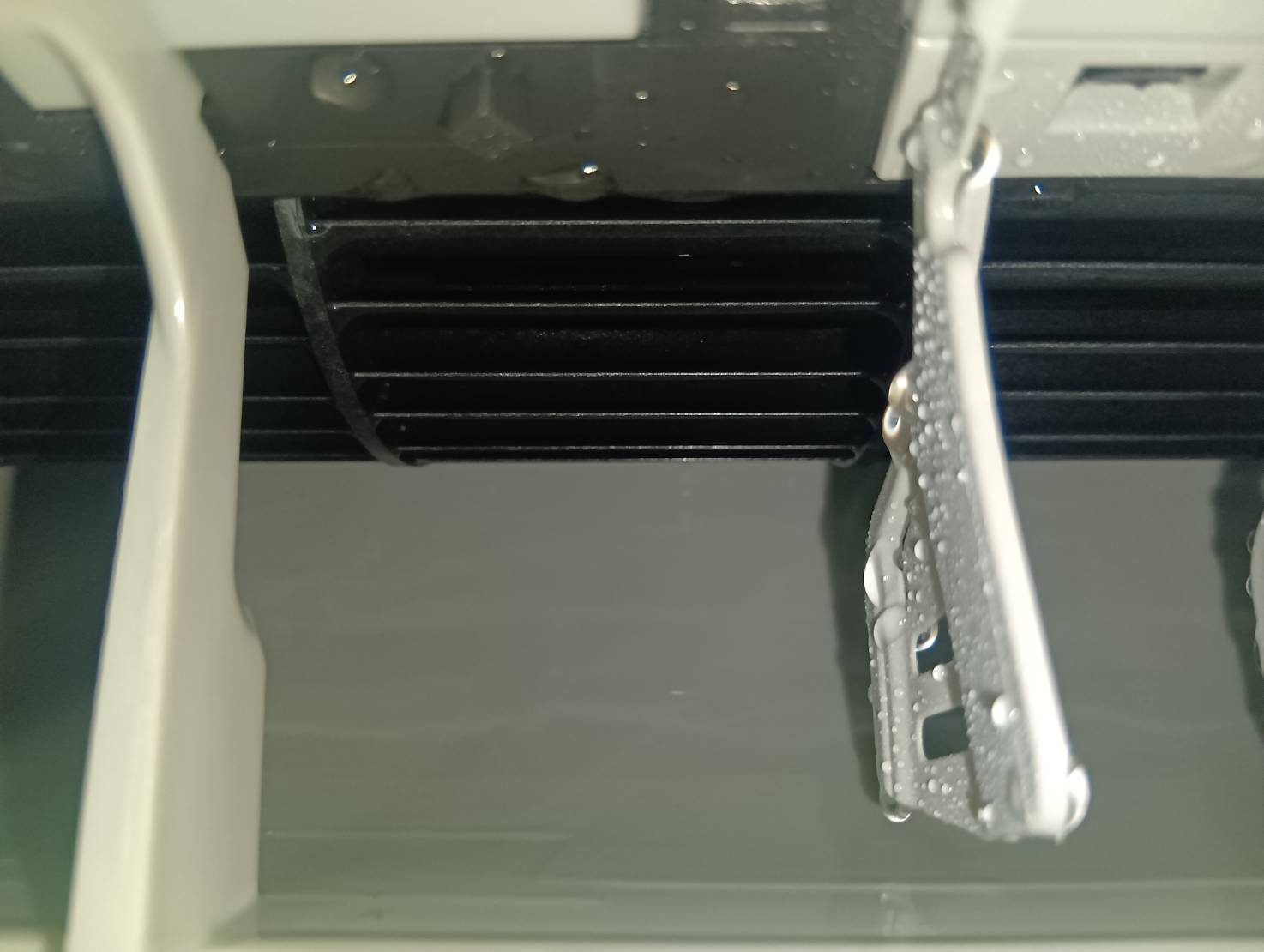 専門業者の作業員さんは、手際よく外装を外し、養生も丁寧です。洗浄機でエアコンに墨を通すと、アルミフィンに詰まった長年の油汚れや埃を根こそぎ洗い流してくれました。
